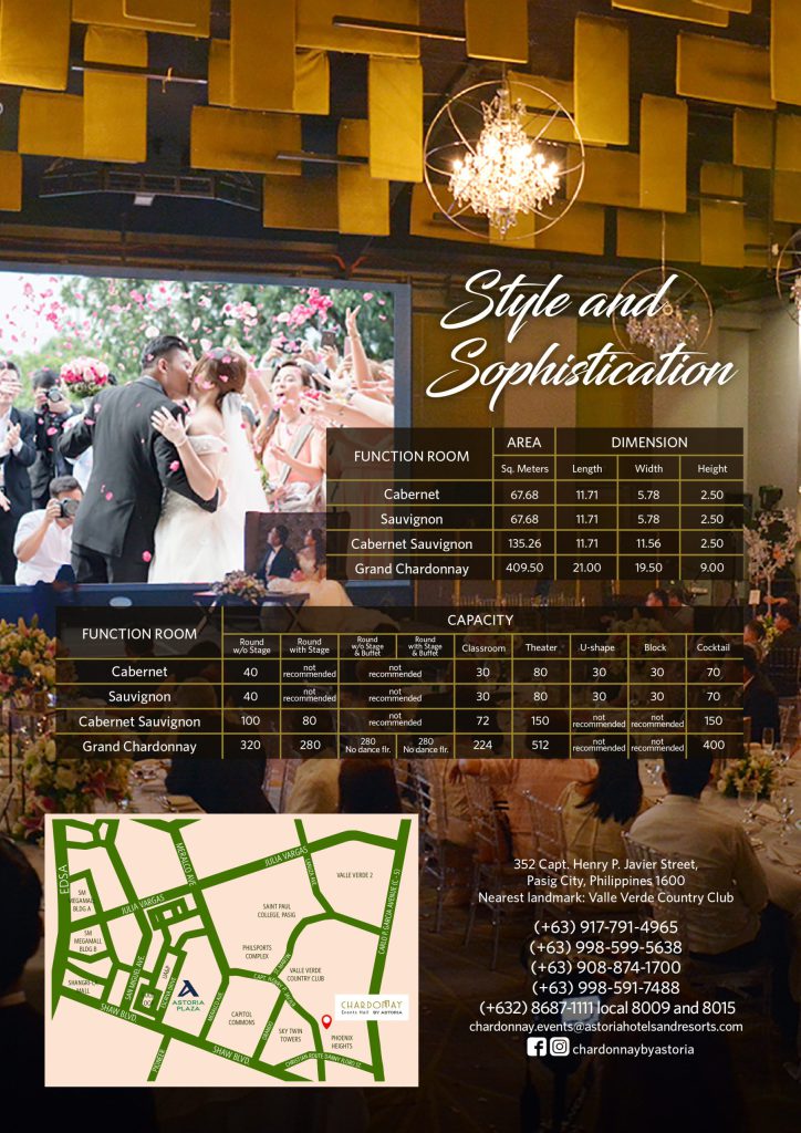 Chardonnay Events Hall By Astoria is a premier venue in Pasig City that redefines elegance and sophistication. Its grand space is meticulously designed to accommodate a variety of events, from lavish wedding receptions and corporate gatherings to intimate celebrations and social soirées.